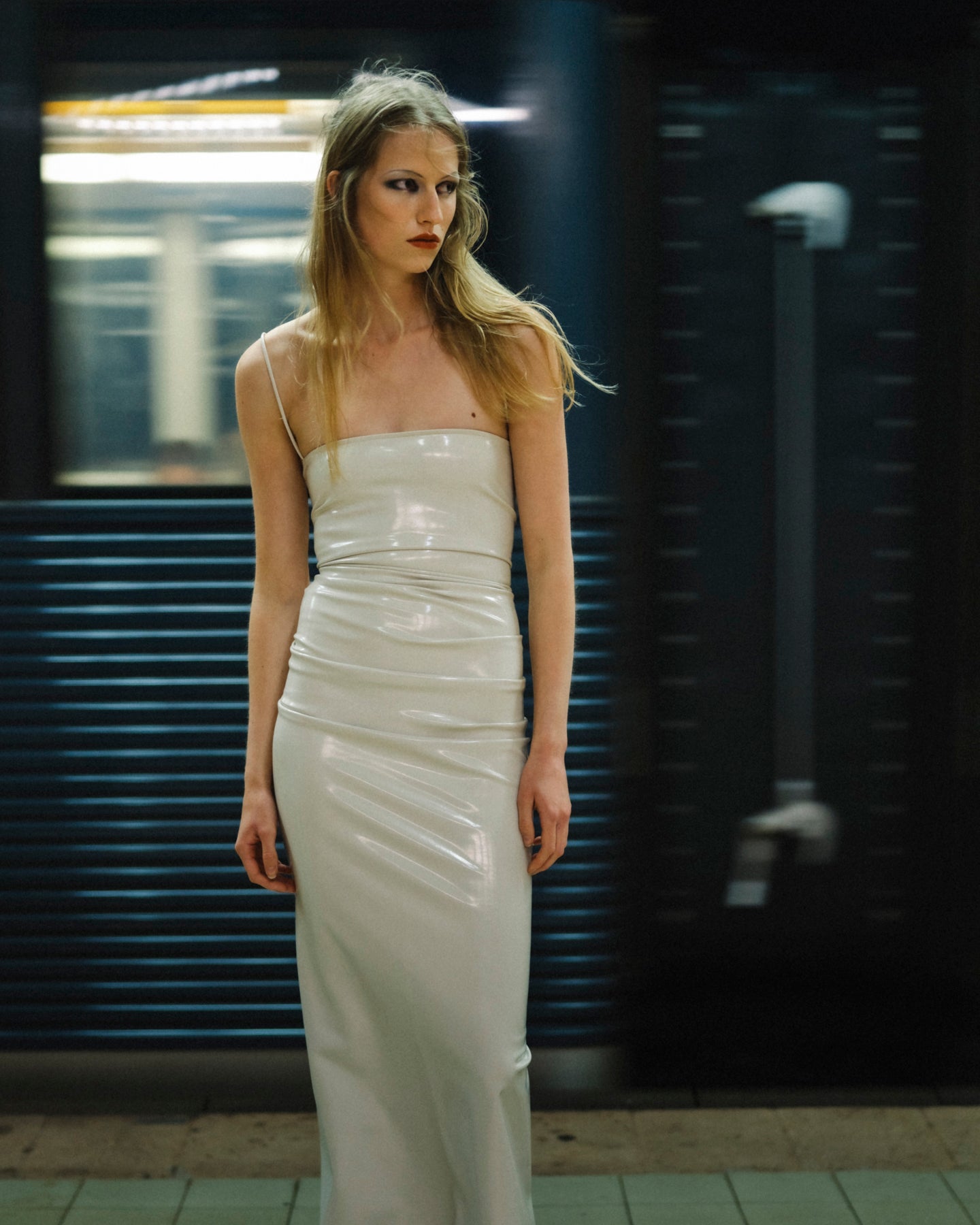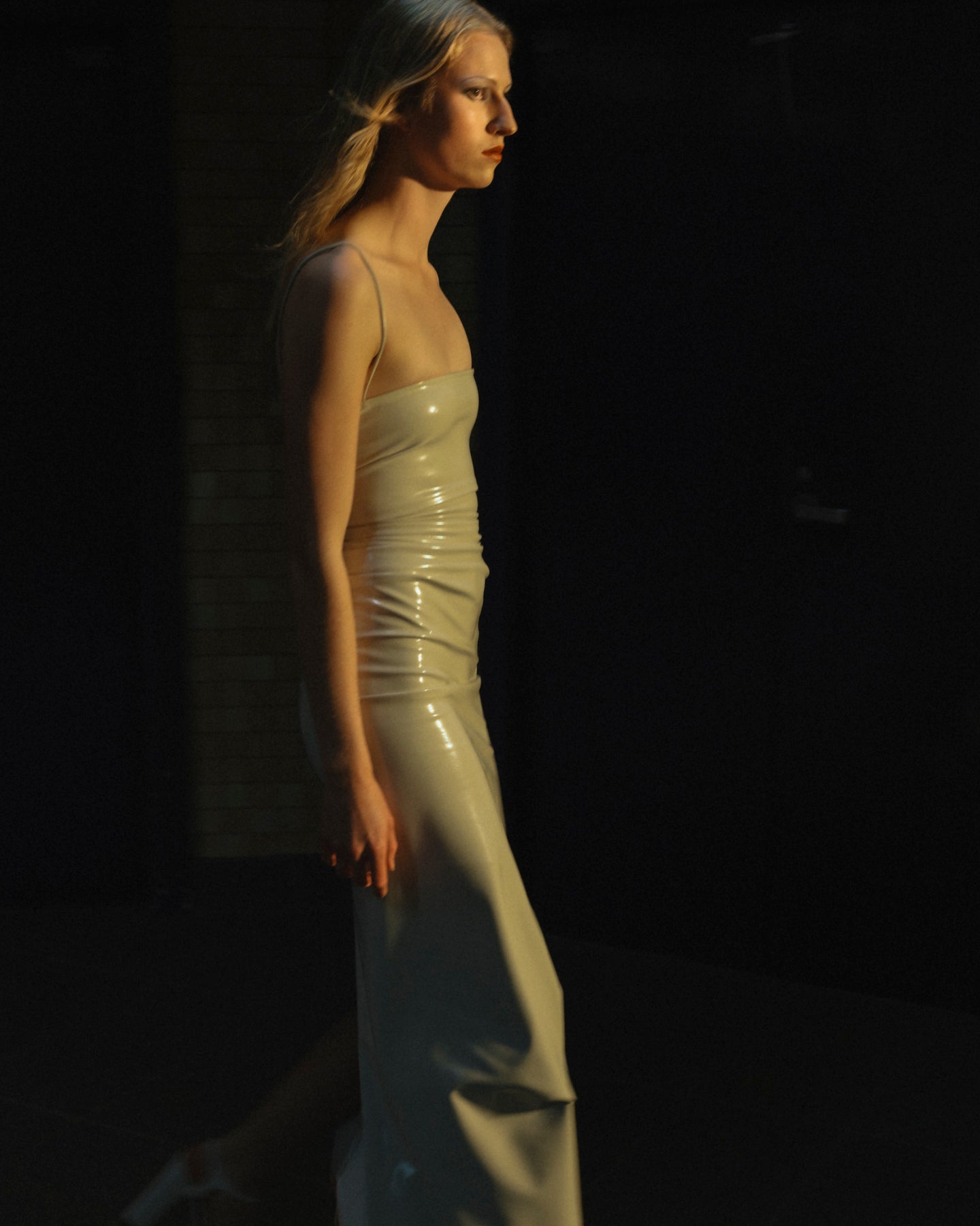 Our bestselling slip dresses in glossy coated jersey developed in Italy, designed for irreverence and mischief.