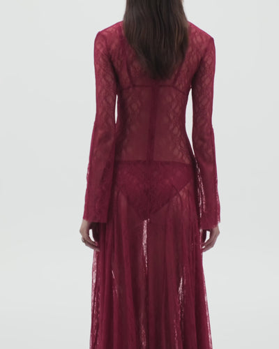 Semi-sheer flare sleeve lace gown with godet hem detail in jam, made in Portugal with super soft stretch lace developed in Turkey. Sold with matching underwear, it offers a hint of effortless provocation. Wear solo if you dare, over high-waisted briefs, or layered under a blazer or coat for additional coverage.