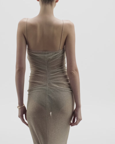 Tucked longline slip dress in gold glitter crafted from fine lurex mesh. This fitted style is finished with asymmetrically tucked back detailing, creating gentle ruching through the garment. Comes with matching underwear for a seamless look.